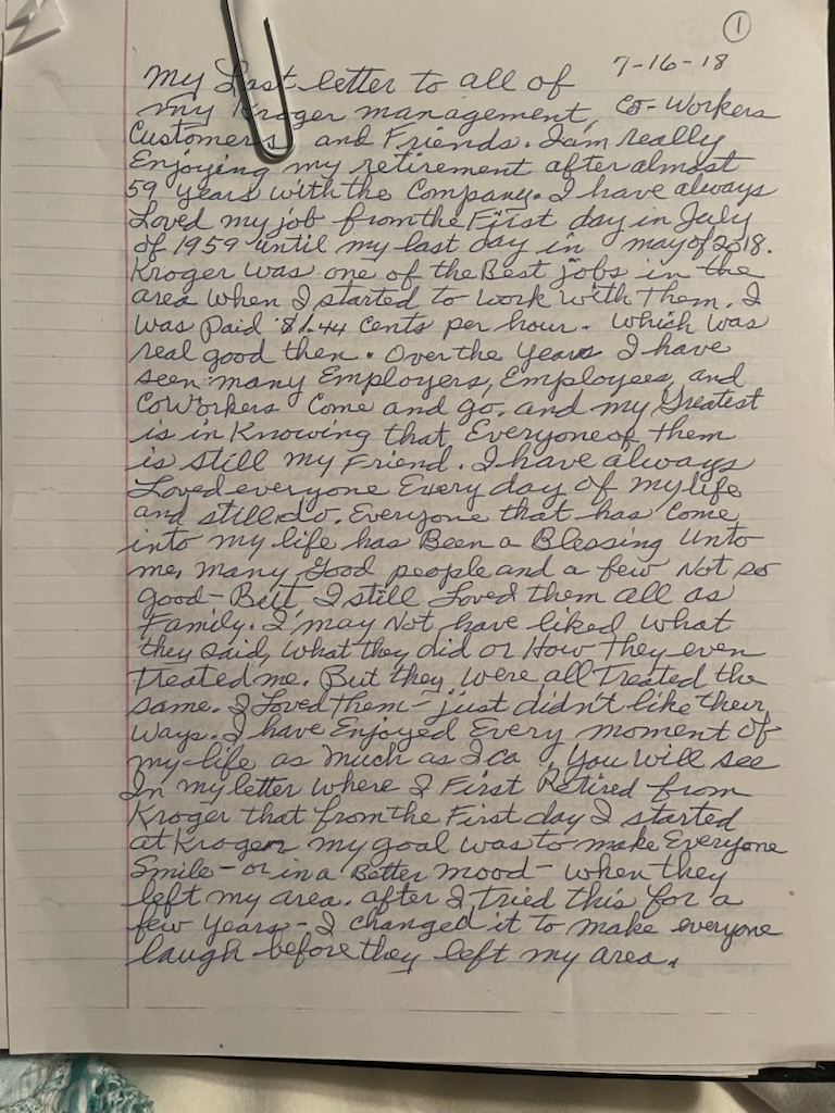 My dad went to work for Kroger at age 16, and never left.  He is the second longest employee for them and pretty proud of that.  59 ½ years.  When my dad moved from the store in Vienna to the store in Belpre, over 80 customers followed him.  He wore many hats there, held many positions, but his favorite was cashier.  Why?  He loved people.  He loved making them smile.  If they didn’t smile, he would take it as a challenge.  Many times, he would pay for people’s groceries who came up short.  He always kept quarters in his pocket for kiddies and often they would ask to stand with Mr. Wilson while their moms shopped because he made them feel special.