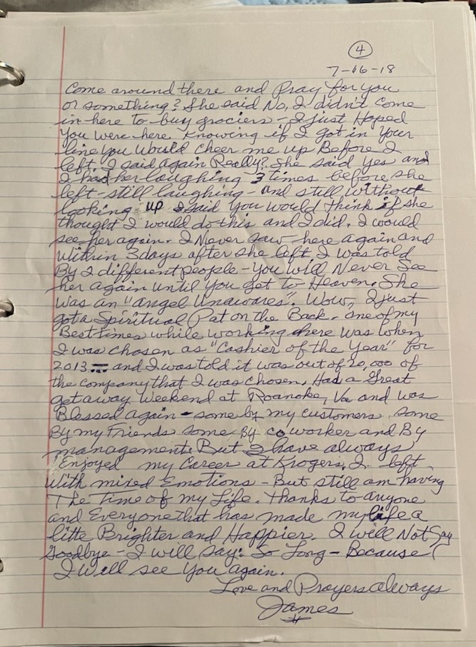 On Senior Citizen day, his check-out line was the longest and people did not care.  When other registers opened they would respond, it’s ok, I want to see Jim.  I remember one time, him telling of the lady who was a regular customer.  She came in one morning rather down, and she said, I had to come and see you today because I knew you would make me smile.  Always smiling, always happy, and always a joke to tell!  That’s my dad.  He said to me once, when I did, you will see a smile on my face because I know where I am going! That was my dad.  Never a cuss word did I ever hear from him.  He truly set a good example of a loyal, kind, generous Christian man.